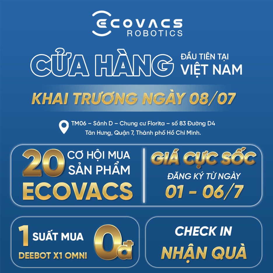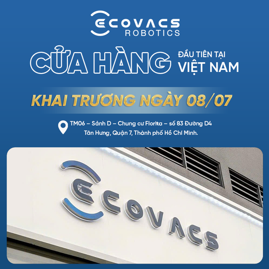 Ecovacs sắp khai trương cửa hàng đầu tiên tại địa chỉ TM 06 Sảnh D, Chung cư Florita, 83 Đường D4, Tân Hưng, Quận 7, TP.HCM. Với tất cả những sự hào hứng đang có, mình sẽ bật mí cho các bạn những hoạt động đặc biệt sẽ diễn ra tại buổi khai trương nhé.